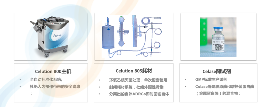 Celution®Celution®800脂肪及脂肪基质成分处理系统在全世界范围内获得241项专利授权。该智能化细胞提取系统可在90分钟内按照GMP标准从脂肪组织中提取出5x10^7以上数量的再生功能细胞(ADRCs)。该全自动、封闭式生产脂肪来源再生功能细胞的提取设备,通过功能模块化设计完成了传统手工制备细胞过程中的系列的关键设备和耗材的替代,实现了细胞制备过程的标准化控制和效率提升。